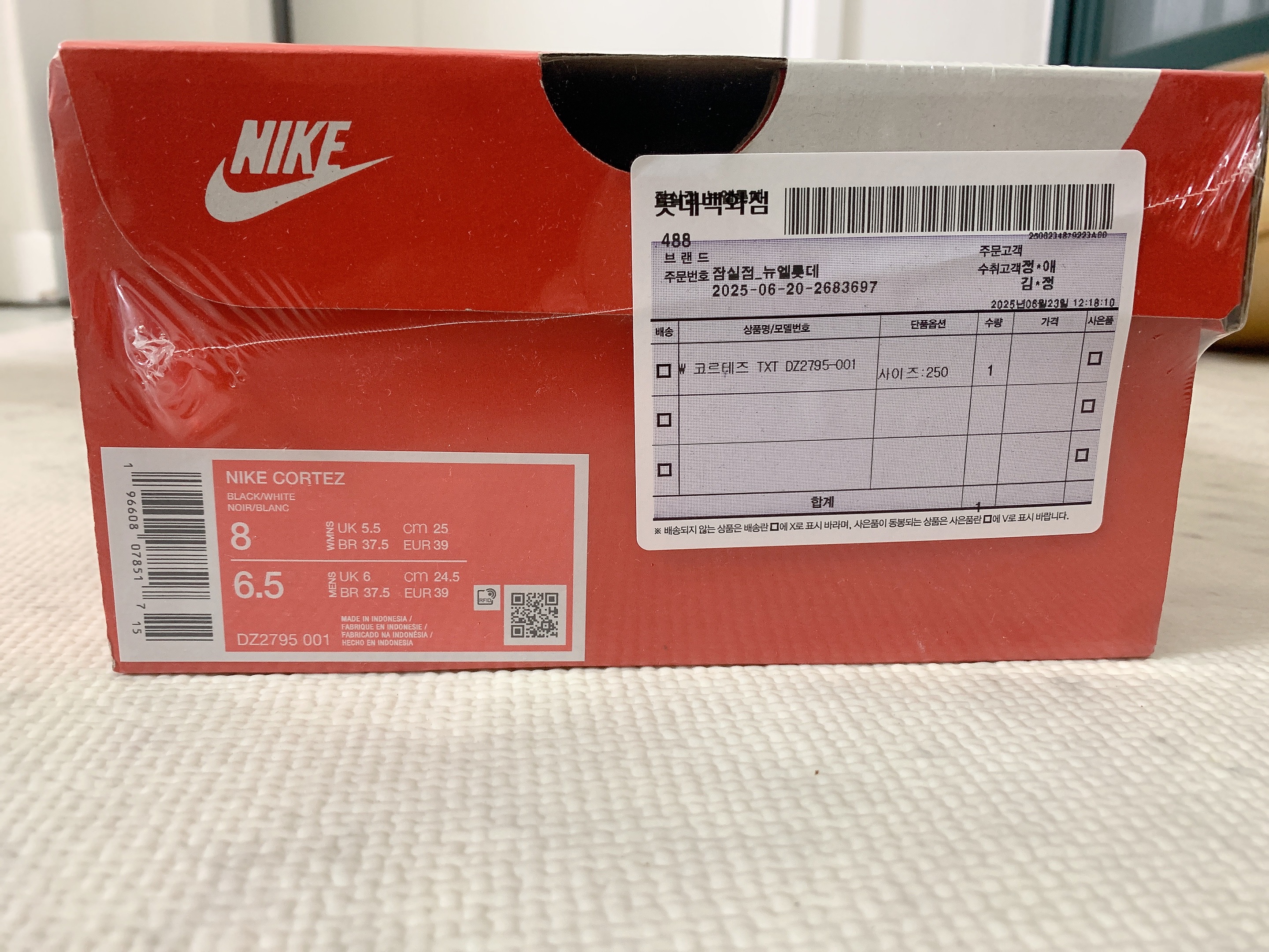 코르테즈는 한 사이즈 크게 구매하라고 해서 250으로 주문했어요.